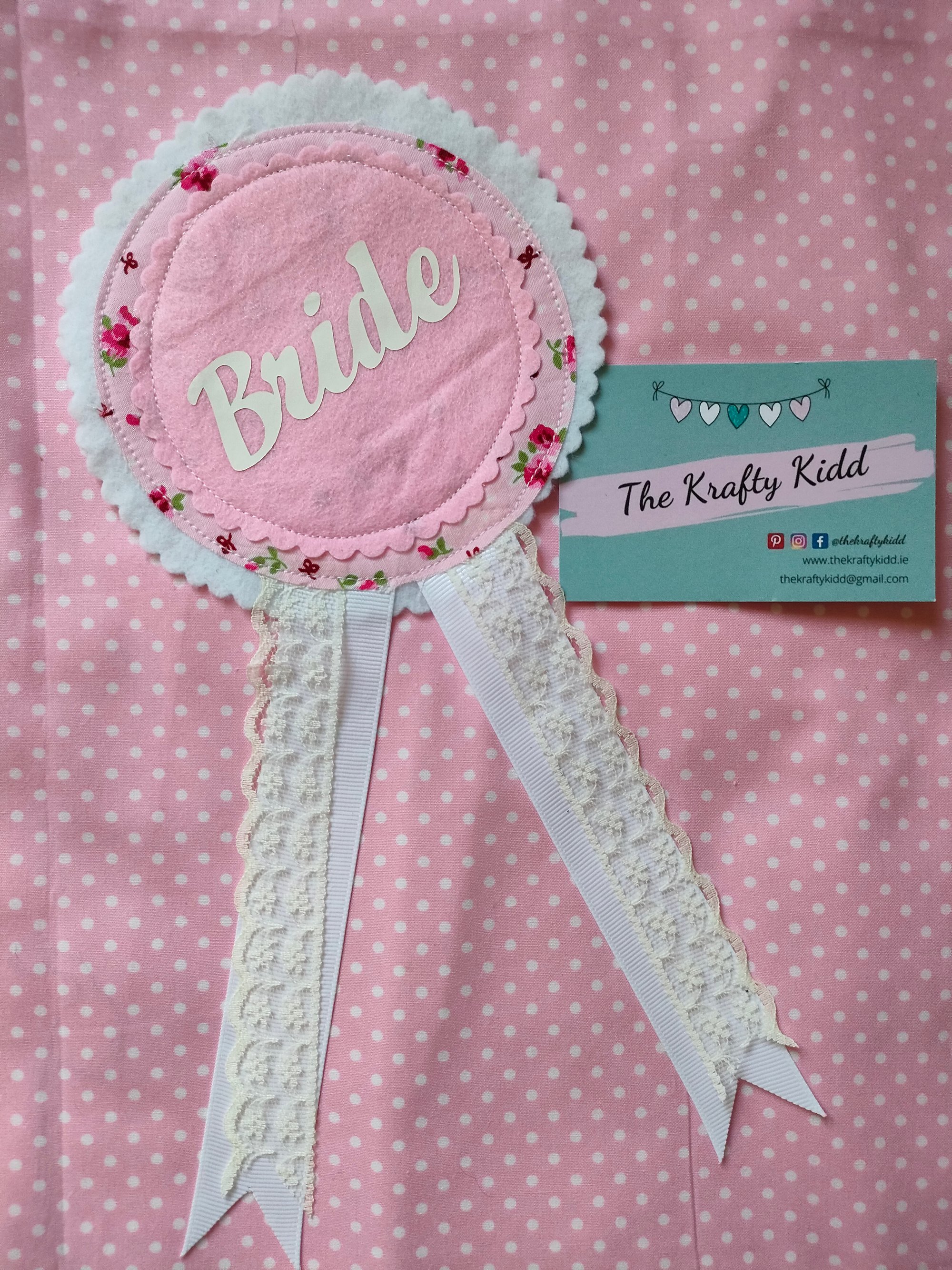 The rosettes are handmade from light pink floral cotton, white felt, pink felt, pink/white satin ribbon and lace ribbon. The white writing is added with heat transfer vinyl. The rosette has a safety pin on the back to attach the rosette securely to your clothing.