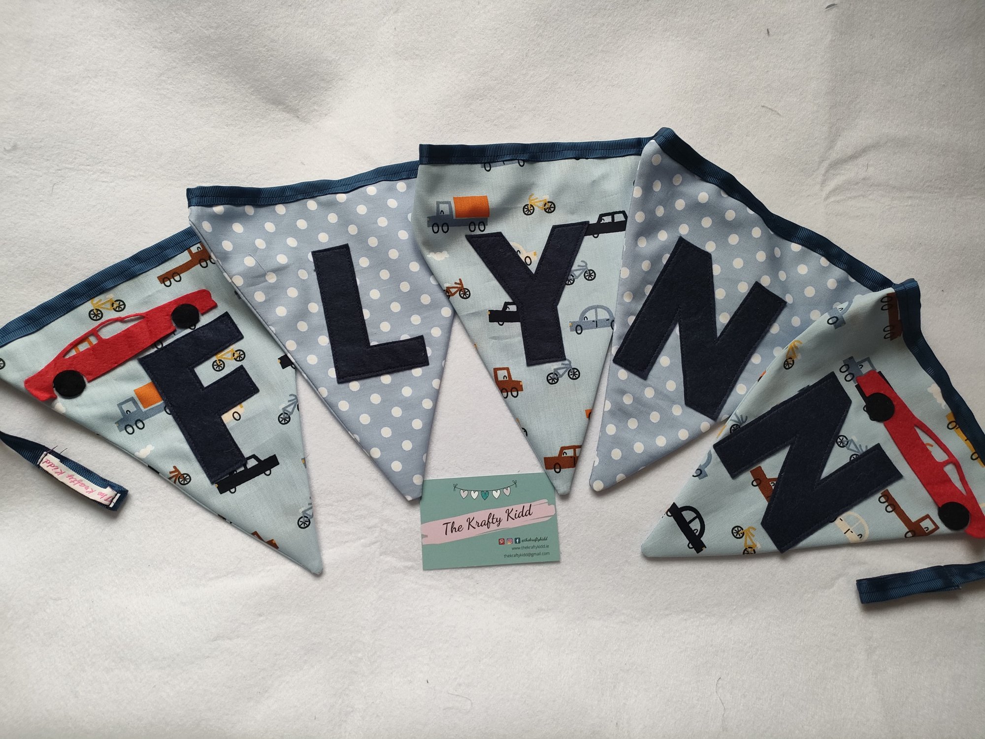 This bunting will be personalised with the name of choice and will have red felt cars added to each end.