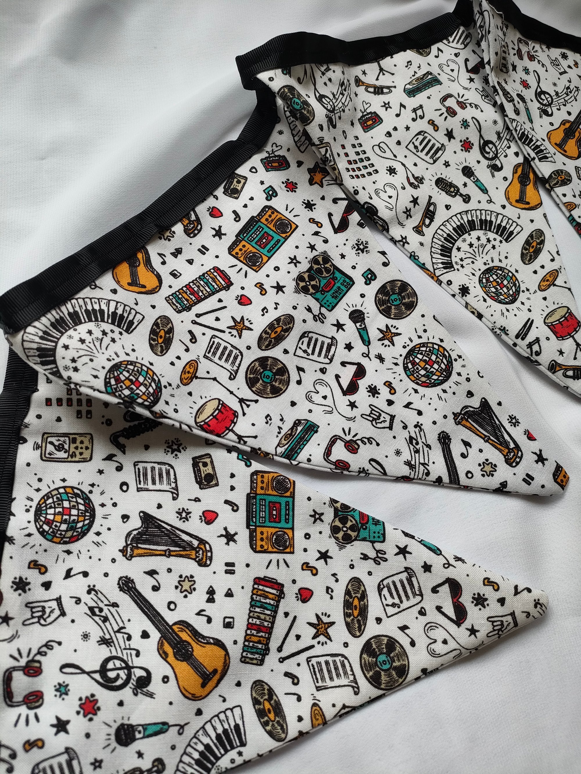 This music bunting is made from 100% cotton fabric. Matching black ribbon is looped at both ends to enable easy hanging.