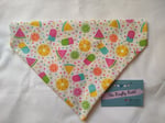 This bright summer dog bandana is handmade from 100% cotton fabric sourced from Irish companies. The colourful ice creams and fruit are on a white background with colourful sprinkles. My doggy bandanas are handmade and slip easily onto a standard dog's collar.